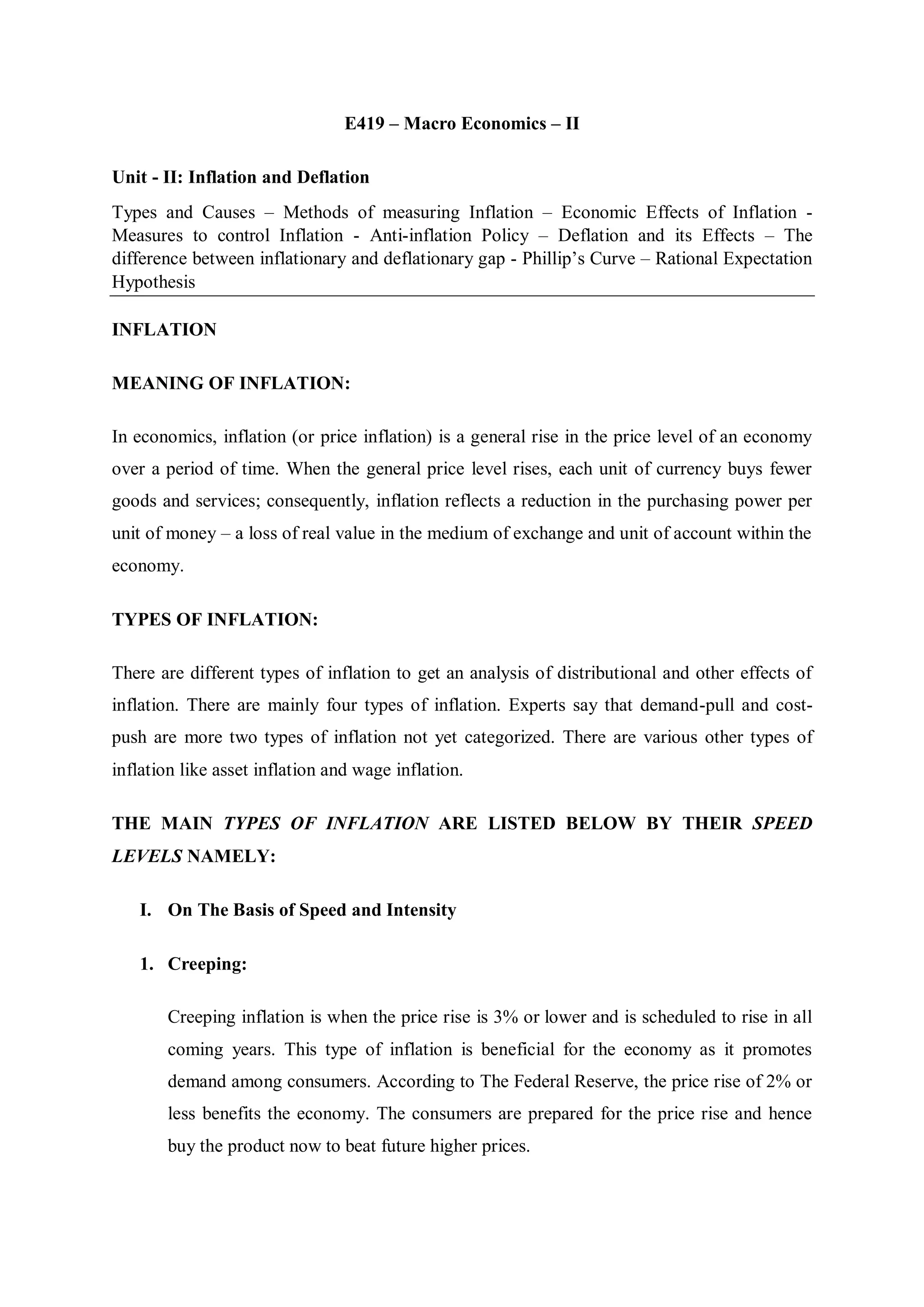 The document discusses inflation and deflation, detailing types, causes, and economic effects of inflation while presenting various methods of measurement and control. It highlights different inflation typologies, such as creeping, walking, and hyperinflation, and discusses terms like the Phillips curve and rational expectations theory. Additionally, it explores consequences of deflation, including increased unemployment and debt burdens, and contrasts deflationary gaps with inflationary gaps.