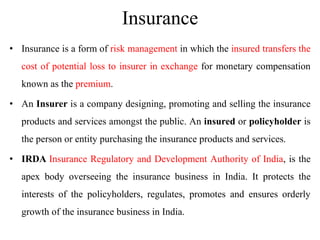 Non-banking financial services include insurance. There are two main types of insurance - life insurance and general insurance. Life insurance provides coverage for death and can include term life, whole life, endowment, and unit-linked plans. General insurance covers property and casualty risks like motor, health, home, and marine insurance. Insurance policies are regulated in India by IRDA and follow principles like utmost good faith, indemnity, and subrogation.