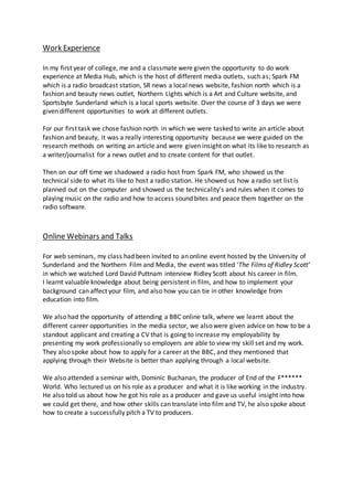 Networking is important in the media industry to showcase work. The author has created online profiles like a Blogger site and LinkedIn to display their work, including showreels and CVs. They have also gained work experience at a media hub where they wrote articles and shadowed a radio host. Additionally, they attended online webinars on topics like Ridley Scott's films and careers in media which provided valuable industry advice.