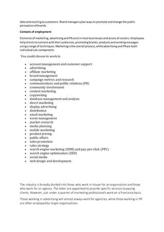 The document provides an overview of the media industries and advertising industry in particular. It discusses various job roles in advertising like copywriters, photographers, art directors, and account managers. It also covers topics like recruitment, qualifications needed, freelancing, and funding options for advertising professionals. The managing team in media companies is important as they oversee projects and allocate work, ensuring efficient collaboration between departments. Networking is key for finding employment as it increases chances of being recommended for openings.