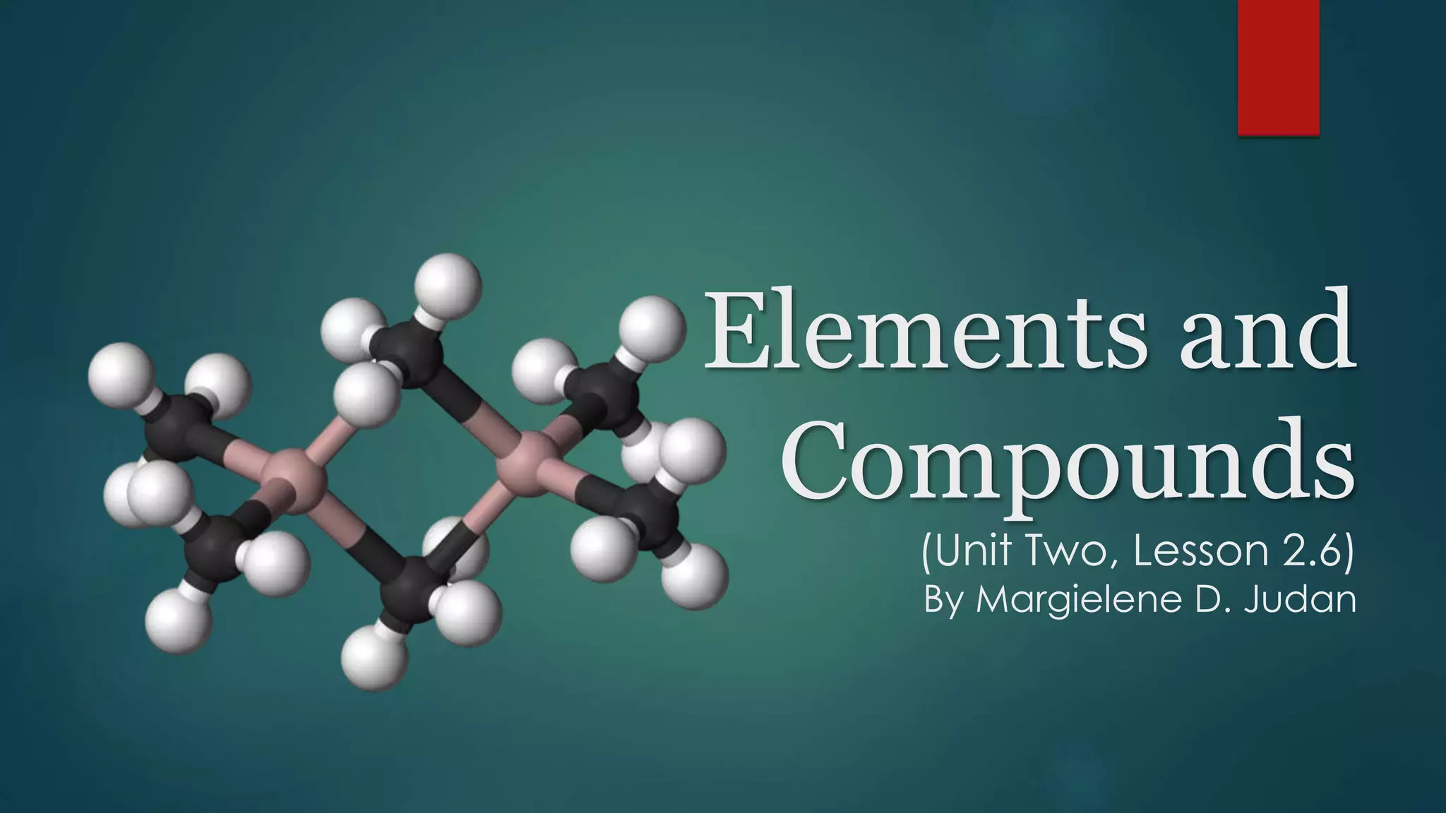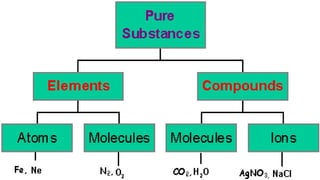 The document outlines the differences between elements and compounds, highlighting that elements consist of a single kind of atom while compounds are made up of two or more kinds of atoms. It also categorizes matter into metals, metalloids, and nonmetals, with a brief mention of the law of definite composition in compounds. Additionally, the document includes examples and classification exercises related to the periodic table.