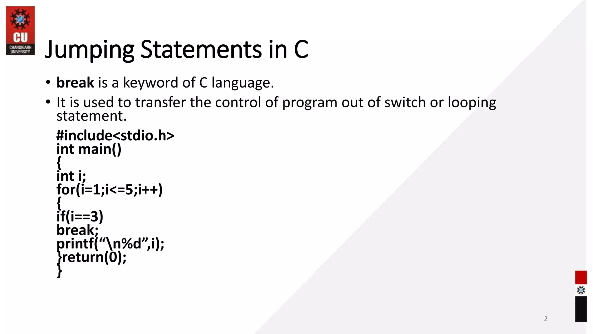 The document discusses various jumping statements in C language - break, continue and goto. It provides examples of each statement.