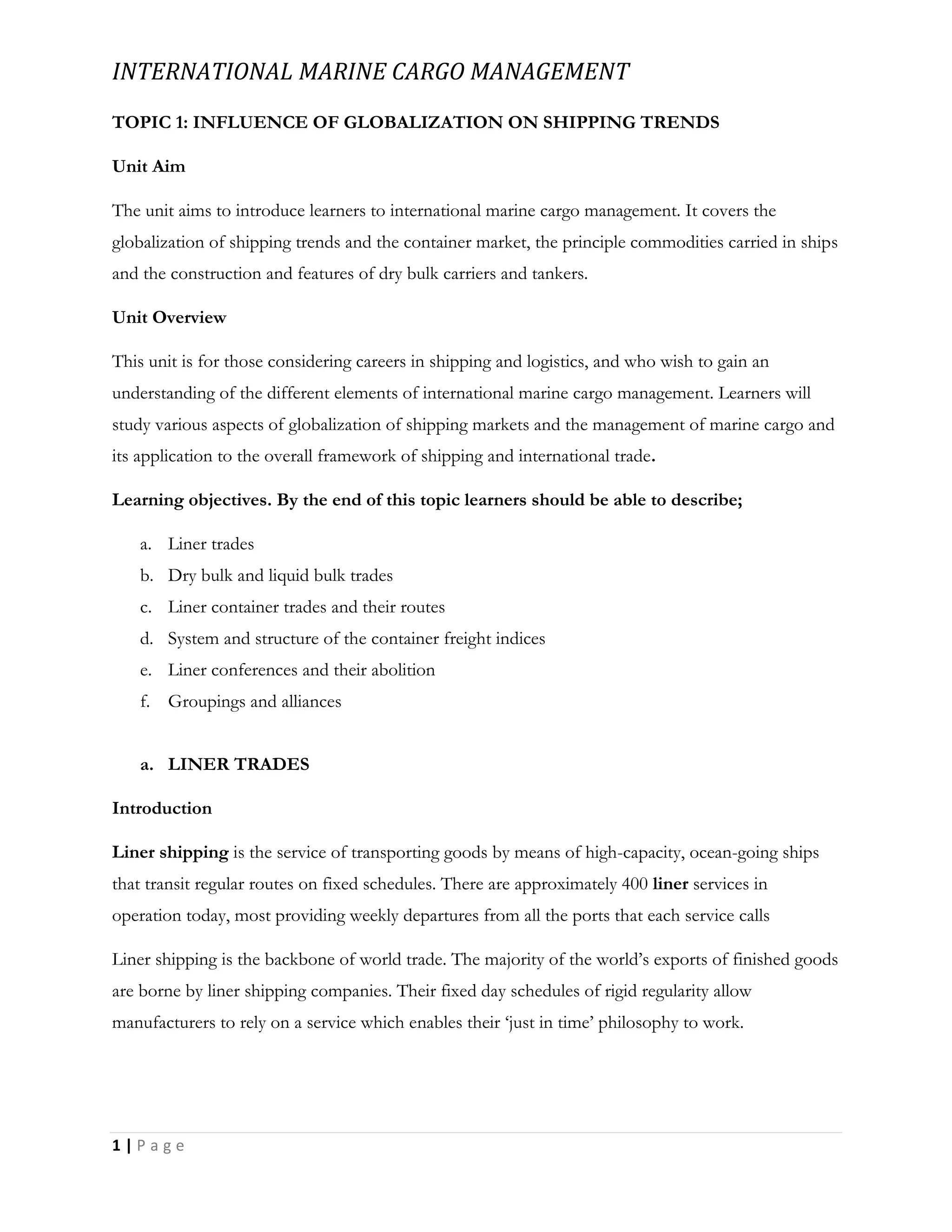 This document discusses the influence of globalization on shipping trends, including liner trades and container markets. It provides details on liner shipping services and their benefits, including efficiency, role in the global economy, and low environmental impact compared to other modes of transportation. The summary discusses how globalization has led to new trading partnerships and shipping routes emerging as countries gained independence and new economic blocs like the EU were formed, shifting cargo flows from traditional north-south routes.