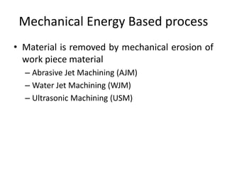 The document discusses three mechanical energy-based machining processes: abrasive jet machining (AJM), water jet machining (WJM), and ultrasonic machining (USM). In AJM, a high-speed stream of abrasive particles erodes material from the workpiece. WJM uses a high-velocity water jet to convert kinetic energy into pressure that removes small chips. USM forces an abrasive slurry against the workpiece using a vibrating tool to remove extremely small chips. Key parameters for each process include abrasive properties, pressure, velocity, vibration frequency, and more. Each method can machine hard materials and provides advantages like avoiding heat, being noiseless, or enabling intricate shapes.