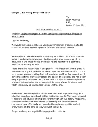 This letter is a proposal from Ferine Cosmetics Ltd. to an advertising agency to promote their new line of men's cosmetics called "X-men". The letter proposes advertising the product through magazines, television, and newspapers to effectively reach their target customer base and ensure the audience sees the product constantly. The budget and costs for the advertising campaign are negotiable contingent on the agency accepting the proposal. The letter asks for a response regarding the proposal within 5 days. However, the letter is poorly written and needs revision to improve clarity and use formal English.