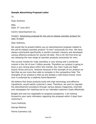 This letter proposes an advertising campaign for a new line of men's cosmetics called "X-men" to be released by Ferine Cosmetics. The letter outlines that the men's cosmetic market in the UK is worth over 2 billion pounds. It proposes advertising the products through magazines, TV channels, and newspapers to effectively reach their target customer base. The letter requests a response regarding acceptance of the proposal within 5 days.
