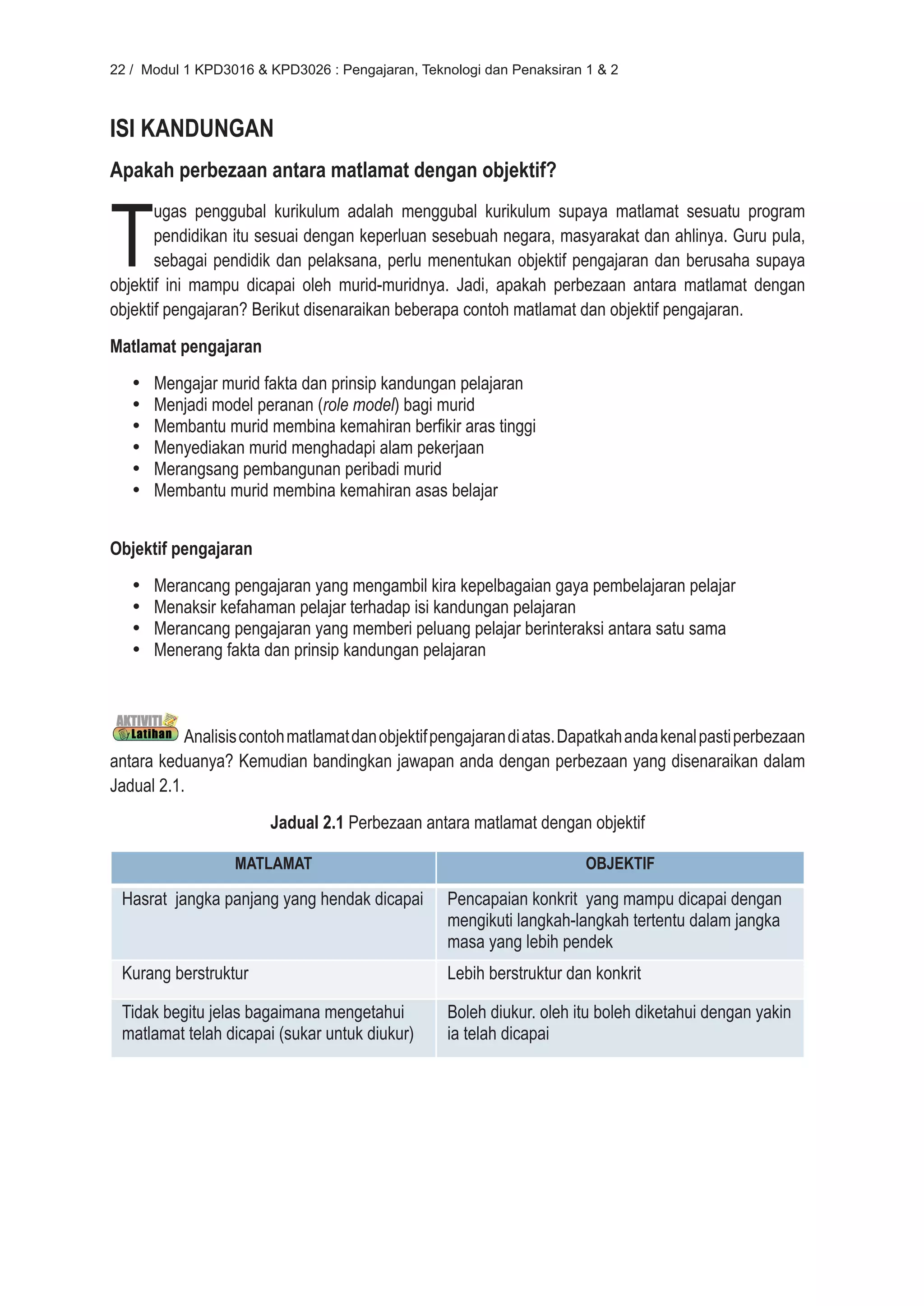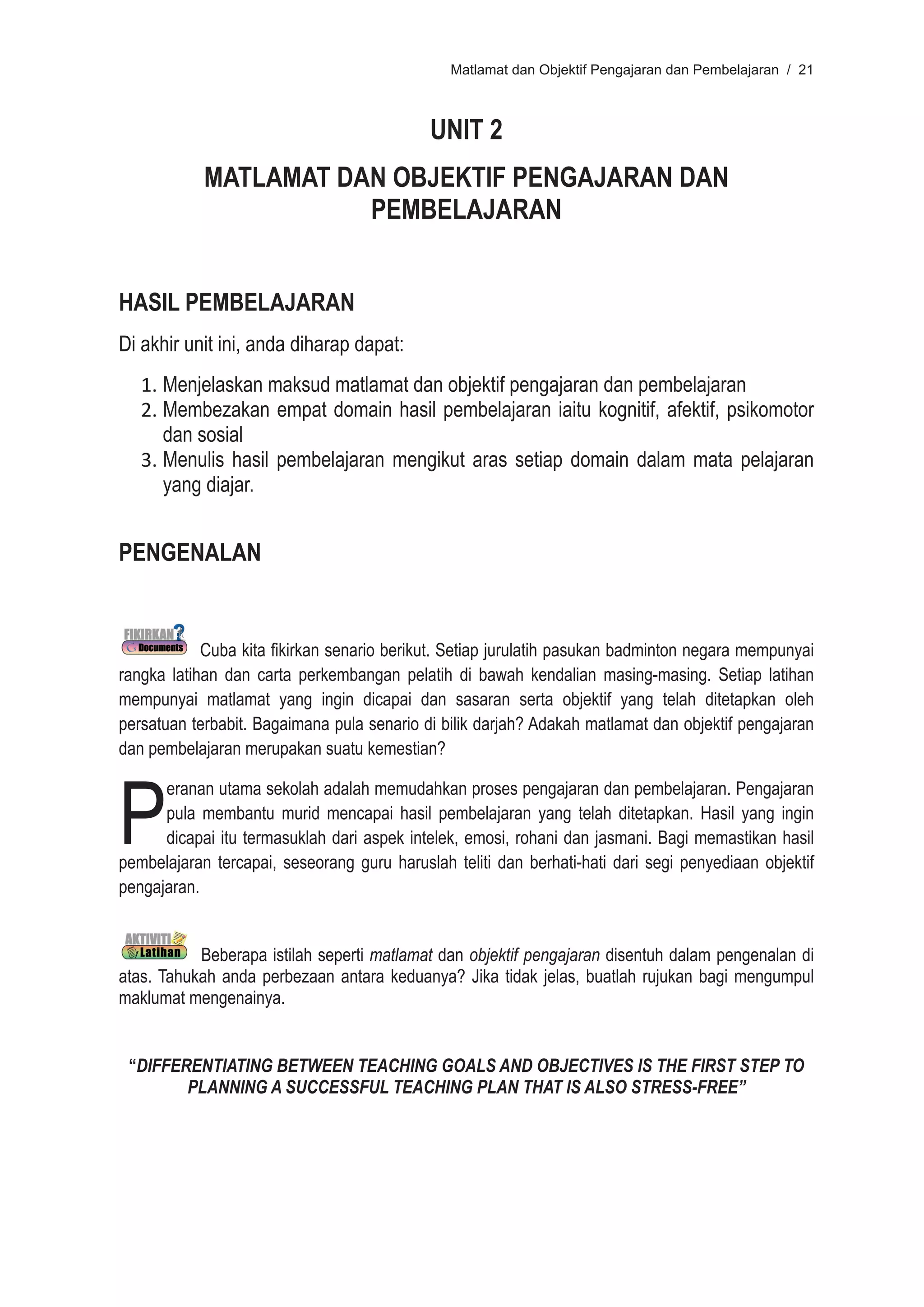 Dokumen ini membincangkan tentang perbezaan antara matlamat dan objektif dalam pengajaran dan pembelajaran, serta bagaimana menulis hasil pembelajaran yang baik. Terdapat penekanan kepada empat domain hasil pembelajaran: kognitif, afektif, psikomotor, dan sosial, yang seharusnya mengikut taksonomi Bloom untuk memudahkan perancangan pengajaran. Objektif yang jelas sangat penting bagi memastikan pencapaian matlamat pendidikan dan membantu guru dalam pengajaran yang lebih berkesan.