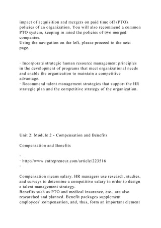 This module covers the strategic, operational, and tactical aspects of compensation and benefits within human resource management, emphasizing their importance in talent acquisition and retention. It highlights the need for HR managers to balance organizational and employee needs while utilizing a mix of monetary and nonmonetary incentives. Additionally, the module outlines the processes of job analysis and performance appraisal, which are crucial for effectively managing talent and evaluating employee performance.