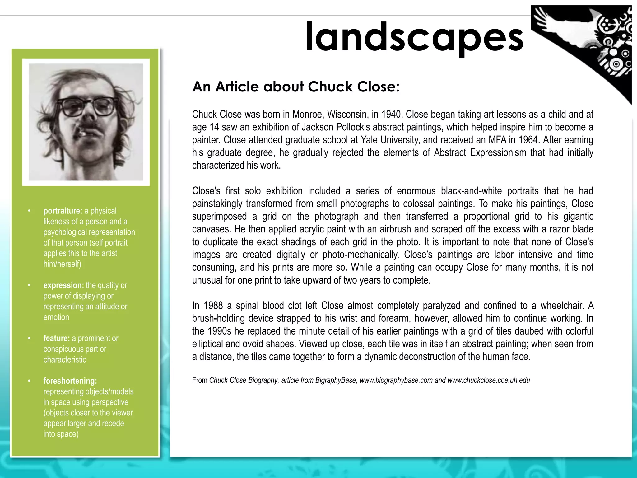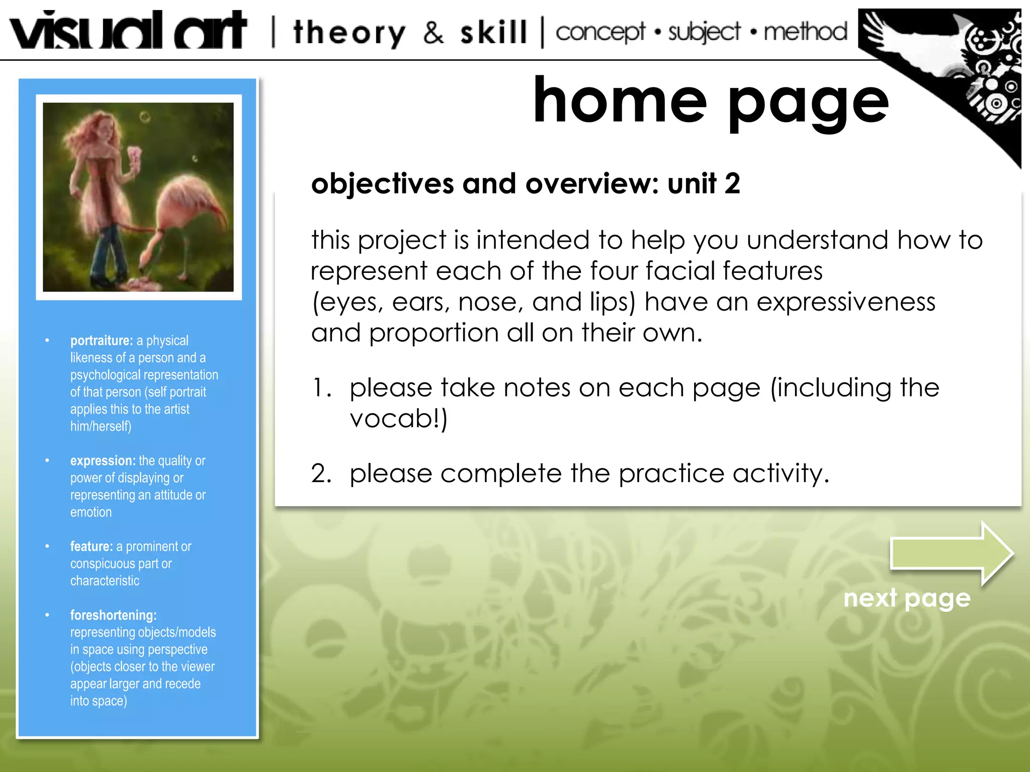 This unit teaches how to represent the four main facial features - eyes, ears, nose, and lips - with expressiveness and proper proportion. Students are asked to take notes on vocabulary terms like portraiture, expression, feature, and foreshortening. They are also instructed to complete a practice activity. The next section explains that individual facial features can be drawn using basic geometric shapes, with the eye as a sphere, nose as a sphere and cylinder, and lips as ovoids. Students are asked to draw sample faces using shapes.