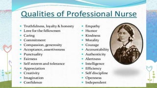 The document discusses nursing as a profession. It defines nursing and outlines Virginia Henderson's definition of nursing as assisting individuals in performing activities contributing to health. It lists the basic principles of nursing as safety, therapeutic effectiveness, comfort, use of resources, and good workmanship. The objectives of nursing are to provide expert bedside care, integrate theory and practice, and develop skills and personality. The concepts of nursing include promoting health, preventing disease, assisting healing, and easing suffering. Nursing is viewed as both an art and a science. The functions of a nurse include caregiver, communicator, teacher, advocate, counselor, change agent, leader, manager, and researcher. Qualities of a good nurse are also outlined.
