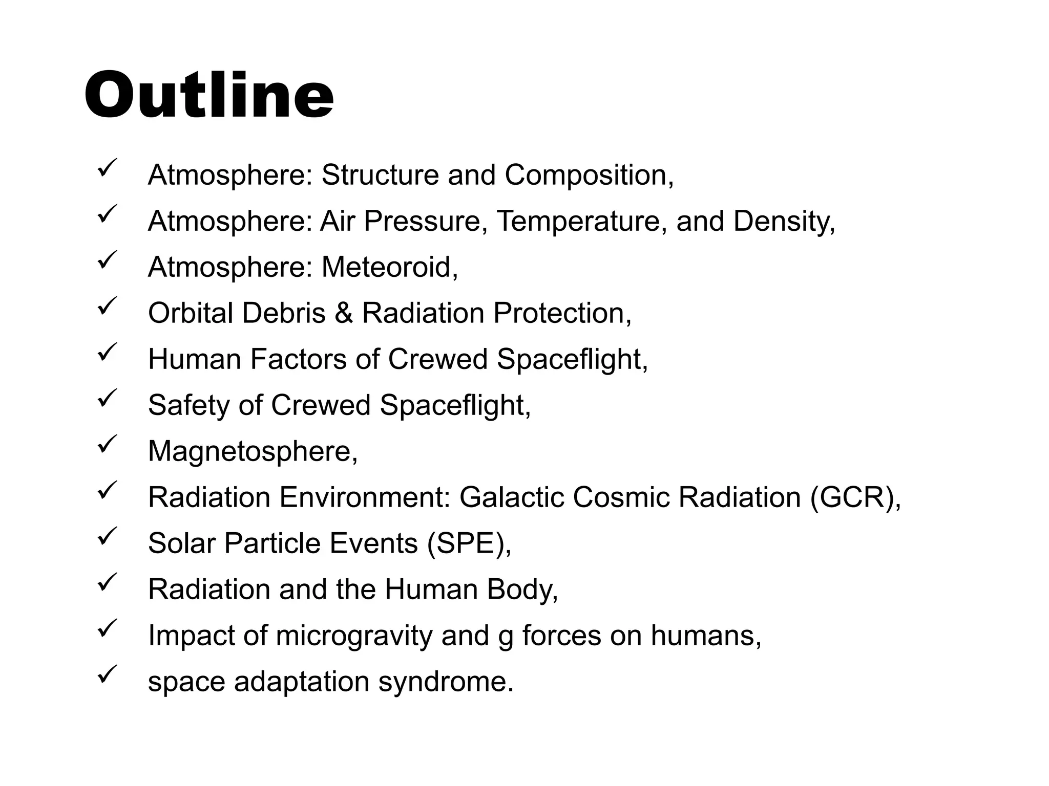 The document presents an overview of the Earth's atmosphere, its composition, and characteristics, emphasizing the significance of various gases such as nitrogen, oxygen, and carbon dioxide. It also covers the historical context of meteorology, atmospheric layers, and the impact of microgravity and radiation in space exploration. Additionally, it touches on space weather and its effects on spacecraft operations, highlighting the importance of designing satellites to withstand extreme environmental conditions.