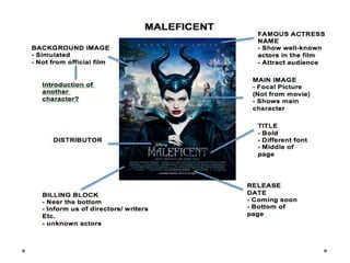 This document provides guidance for students on analyzing film posters and creating their own mock film poster. It discusses key elements to identify when analyzing posters such as the title, stars, images, and release date. Students are instructed to analyze an example poster by annotating these elements. They will then analyze the meaning conveyed through the poster's visual style, colors, and tagline. The document outlines requirements for students to plan their own poster, including images, layout, and fonts. It notes they will complete a photo shoot and design mock-ups of their poster.
