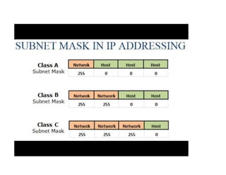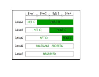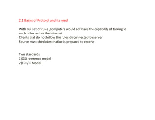 The document discusses network devices, communication protocols, and related topics. It describes the OSI reference model and TCP/IP model, detailing the layers and functions of each. It provides information on IP addressing, DNS, and gateway addressing. The OSI model has 7 layers including physical, data link, network, transport, session, presentation, and application layers. The TCP/IP model has 4 layers comprising network interface, internet, transport, and application layers.