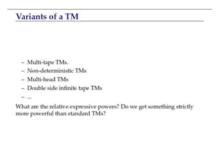 The document discusses pushdown automata (PDA) and Turing machines, exploring their definitions, functionalities, and the relationships between them. PDAs can recognize context-free languages using a stack to manage input and transitioning states, while Turing machines are shown to accept recursively enumerable languages and simulate any computable algorithm. The document provides examples of specific PDAs for languages and outlines the concepts of decidable and undecidable problems in relation to Turing machines.