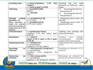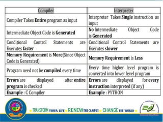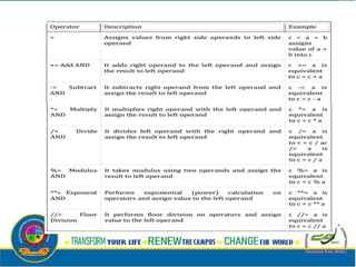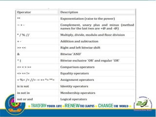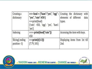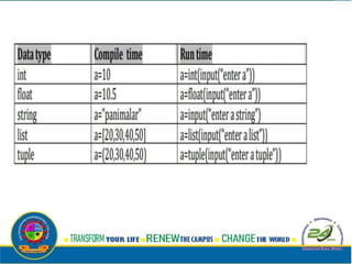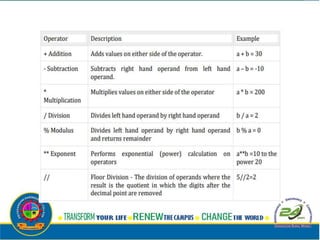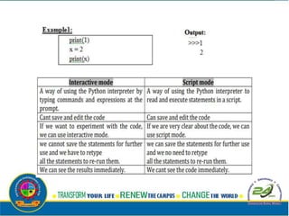 The document discusses Python programming concepts such as data types, variables, operators, and input/output. It provides examples of Python code and explains key features like: