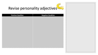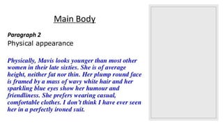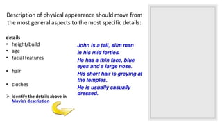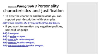 This document covers the concept of relative clauses and pronouns in English, detailing their use in providing additional information about nouns. It explains defining and non-defining relative clauses, gives examples of sentence structures, and details how to use relative pronouns appropriately. Additionally, it includes writing tips for describing a person, focusing on appearance and characteristics.