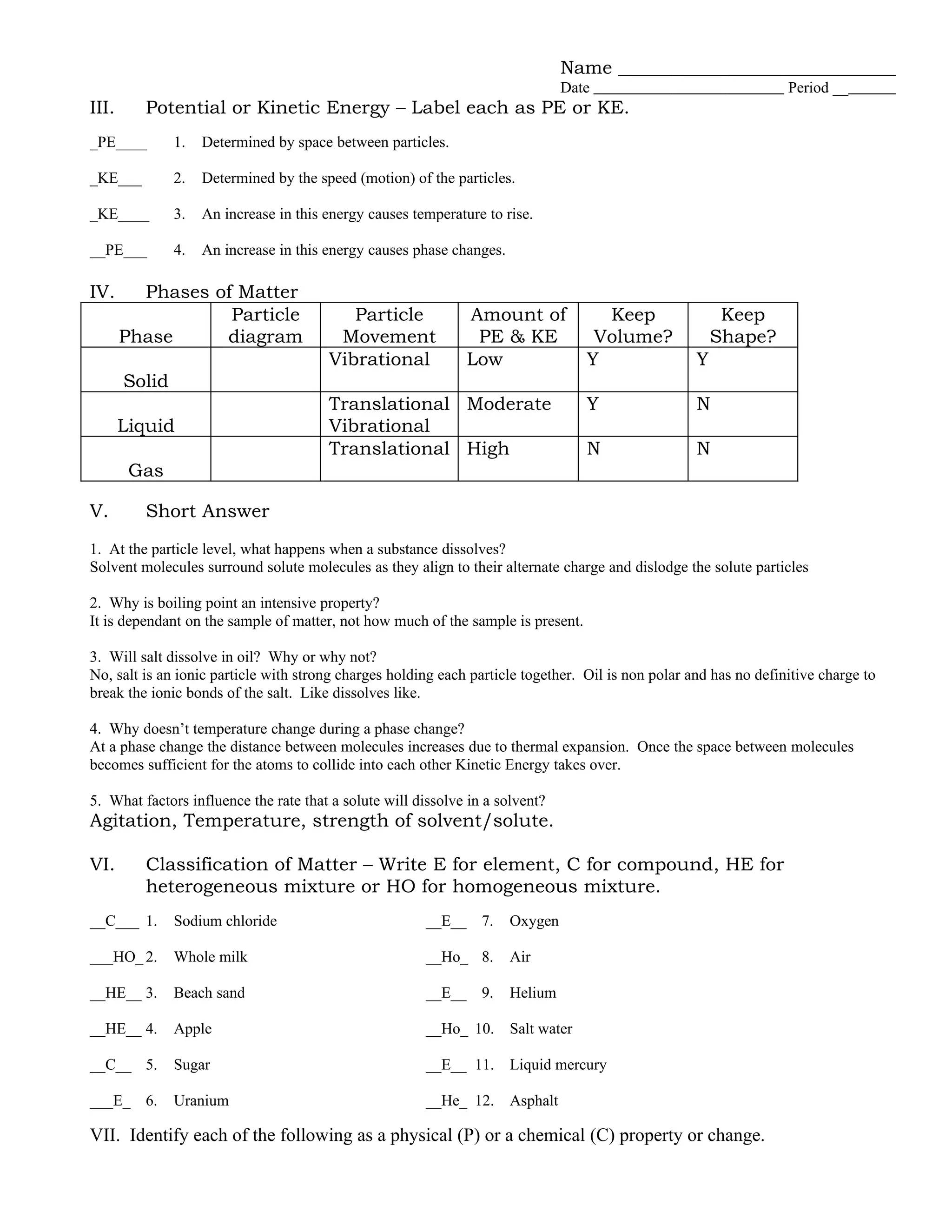 The document provides a review of chemistry concepts related to matter and energy, including defining key terms like physical and chemical properties, classifying mixtures and phases of matter, explaining phase changes and energy transfers. It covers the particle model of matter and kinetic molecular theory, properties of solutions, and classifying substances and changes as physical or chemical. Sample problems are included on heat transfer during phase changes and calculating energy changes.