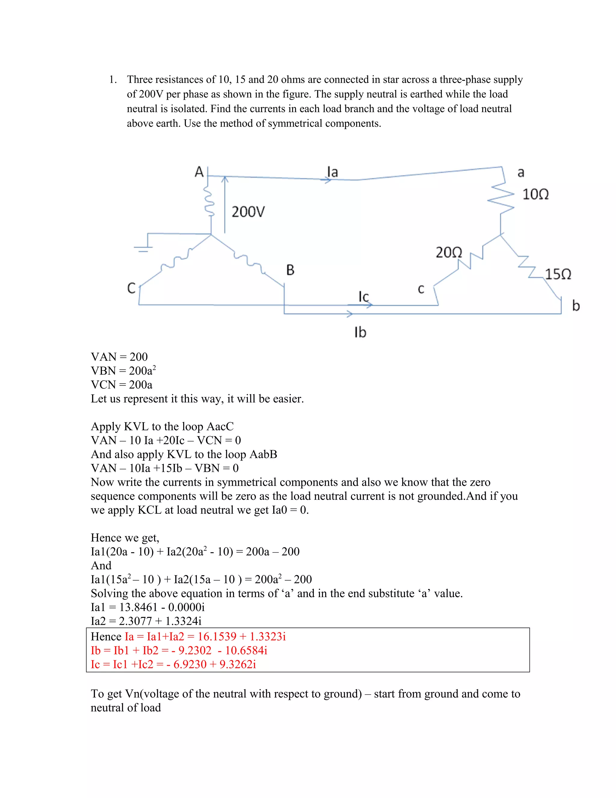 The document describes calculating currents in a star-connected load using symmetrical components. It finds: