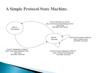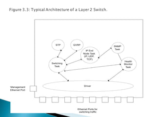 This chapter discusses software partitioning in communications systems. It describes how the OSI model can be used to partition functionality but may not be optimal for performance. It then discusses partitioning software into modules and tasks, providing an example decomposition of an Ethernet switch. Key concepts covered are protocol dependencies, performance considerations, and hardware configuration challenges related to strict layering.