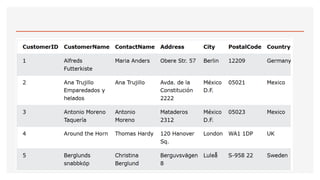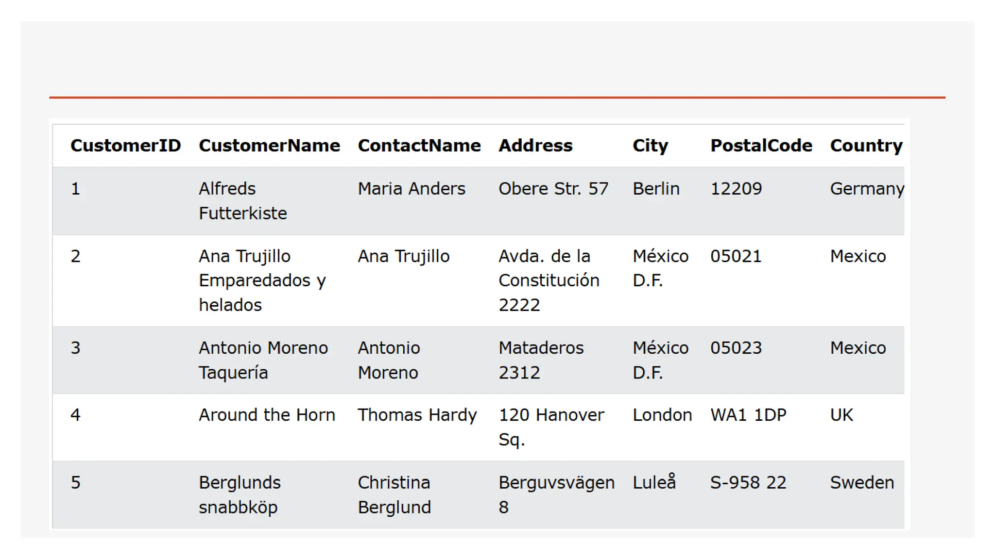 • The fields in the Customers table consist of CustomerID, CustomerName, ContactName,