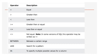 • The GROUP BY statement groups rows that have the same values into summary rows, like "find the number