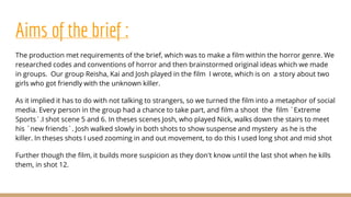 The group produced a short horror film called "Extreme Sports" to meet the brief of making a film in the horror genre. Each group member had specific roles in pre-production such as writing the script, creating a storyboard, and planning shot types. During production, various shots were filmed including scenes where the character Josh slowly walks down stairs to meet his "new friends" to build suspense. In post-production, the group edited the film, added sound effects and music. Though there were challenges like unsteady camera work, the group was able to successfully complete the film and meet the requirements of the brief through collaboration and planning in pre-production, production and post-production.