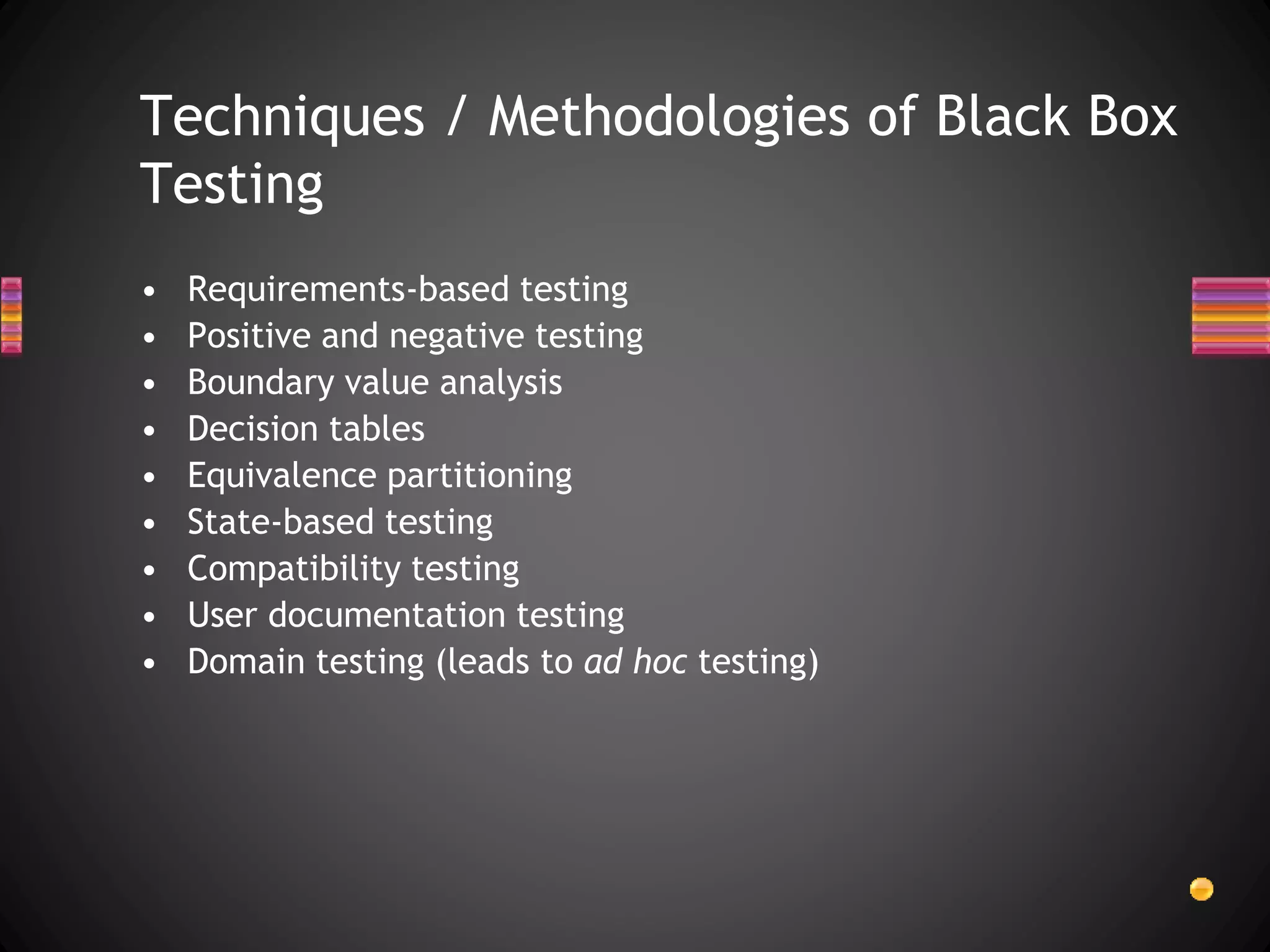 The document discusses various techniques for white box testing including static testing and structural testing. Static testing involves techniques like desk checking, code walkthroughs, and code inspections that do not require executing the code. Structural testing techniques execute the code and include unit testing, code coverage testing, and complexity testing. Code coverage criteria like statement coverage and branch coverage are discussed as ways to measure how thoroughly the code has been tested. Control flow graphs are presented as a way to represent program logic and control flow.