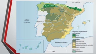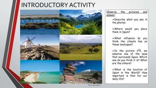 This document provides an overview of the natural environment of Spain. It begins with an introductory activity asking students to observe photos and answer questions. It then covers the relief of Spain, describing its various mountain ranges, plateaus, and depressions. Next, it discusses the climate of Spain, outlining the different climate zones. It also includes a vocabulary list of geographic terms. The document concludes with a section on the biogeography of Spain, describing the various vegetation regions determined by climate and relief. Activities are included throughout for students to apply the concepts.