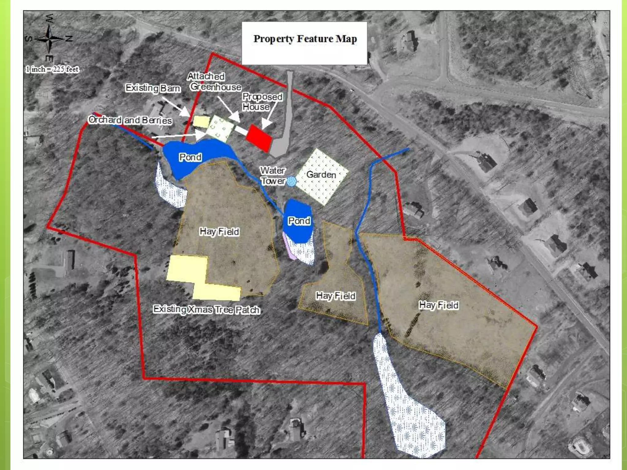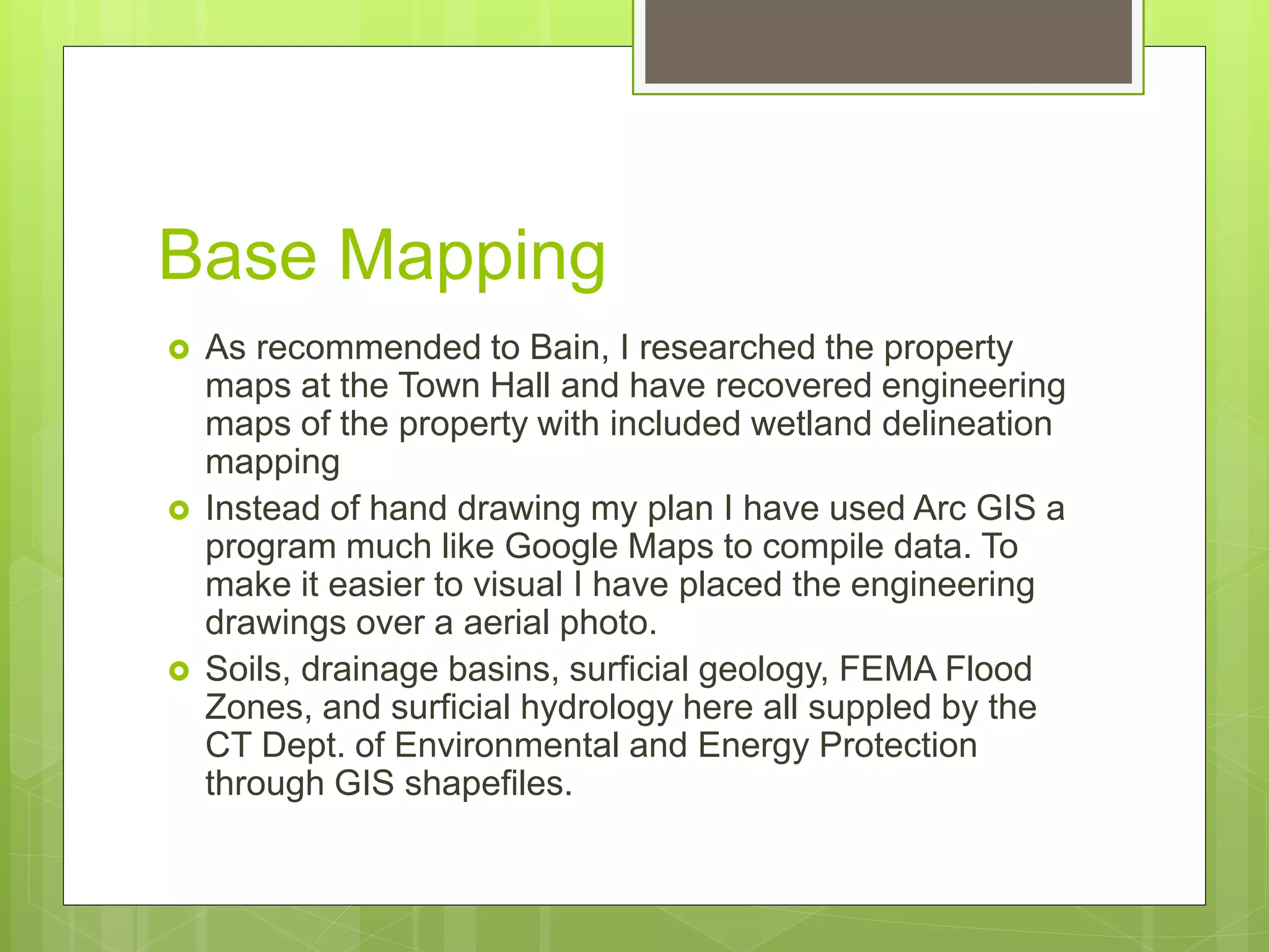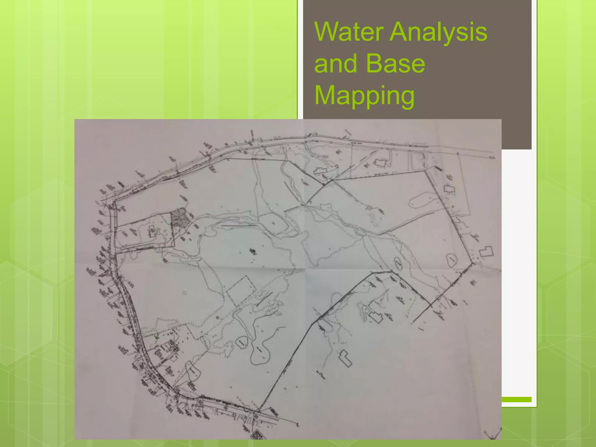 This document summarizes the water resources analysis and base mapping for a property. It finds that the property contains two ponds, wetlands, and streams fed by average 53 inches of rainfall annually. Soil types were identified. ArcGIS was used to compile data and engineering drawings. The goals are to store water high, release it clean, and slow flow by using the ponds for irrigation and livestock water and installing forested swales.