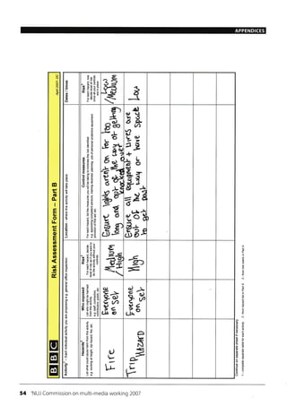 This document contains a general risk assessment form for a BBC production. It lists the team members involved in the production, which includes Cameron Millar and Barney Law. It also provides a hazard list and risk matrix to determine the likelihood and severity of potential harms. The form is used to outline the risks assessed for the production and get authorization from a supervisor.