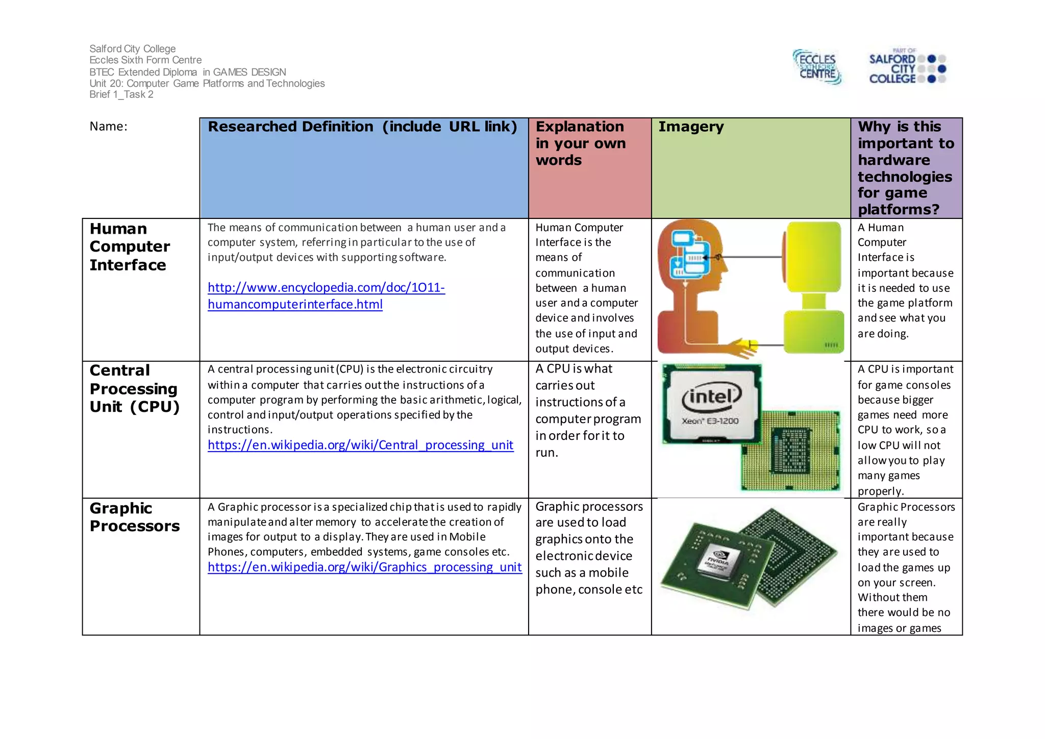 The document defines and provides explanations and links for key hardware technologies used in game platforms. It discusses the central processing unit (CPU), graphic processors, memory (RAM), display, sound, game storage medium, interface devices, connectivity, and power supply. It explains that these components are important for games because the CPU handles instructions, graphic processors load graphics, RAM temporarily stores content, the display shows images, sound provides audio, storage saves game data, interface devices allow human interaction, connectivity enables online play, and the power supply turns the system on and off. The document aims to educate about the basic hardware that makes game platforms function.