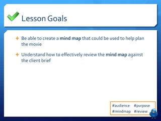 The document discusses creating a mind map to plan a sci-fi movie. It defines key terms like mind map, audience, and purpose. The goals are to create a mind map for the movie and review it against the client brief. Learners are instructed to make a mind map with a central idea and branches covering areas like characters, location, and audience, and then evaluate how well it meets the purpose.