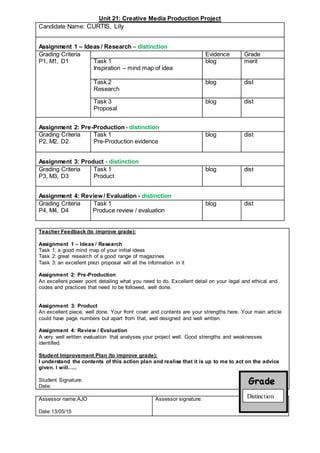 This document summarizes a student's grades and feedback from their creative media production project assignments. The student, Curtis Lily, received distinctions for all four assignments: ideas/research, pre-production, product, and review/evaluation. The teacher provided positive feedback and noted strengths for each assignment. For improvement, page numbers could be added to the product. The student agreed to an improvement plan by signing and dating the document. The overall assessment was distinction.