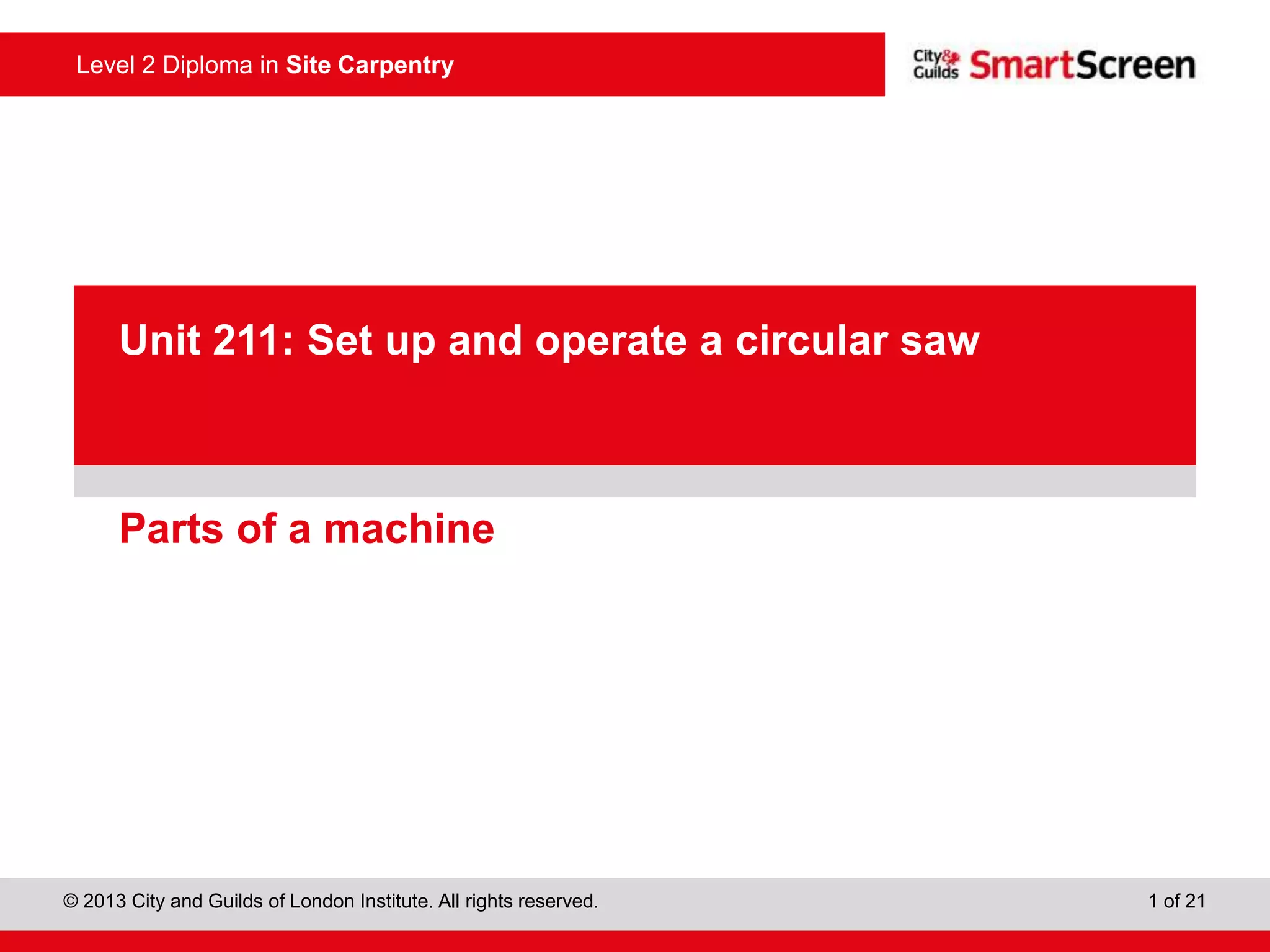 This document provides guidance on safely operating a circular saw. It identifies the key components of a circular saw including the crown guard, riving knife, and extension table. It explains the proper positioning of these components and notes common faults like missing or damaged guards. The document emphasizes following regulations and guidance from the HSE to prevent accidents and ensure all operators are trained, competent, and follow safe working practices.