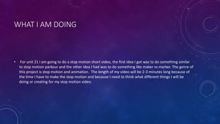 Luke Smith proposes to create a 2-3 minute stop motion animation video as a personal project. He has ideas for parkour or maker vs marker themes. The target audience would be children through adults. He plans to use play-doh or computer animation and is considering titles like "Stop Motion by Luke Smith". Any music used would require copyright permission and all animations would be Luke's original creations against a plain white background. Ethically, good characters will win without harming animals or influencing children negatively.