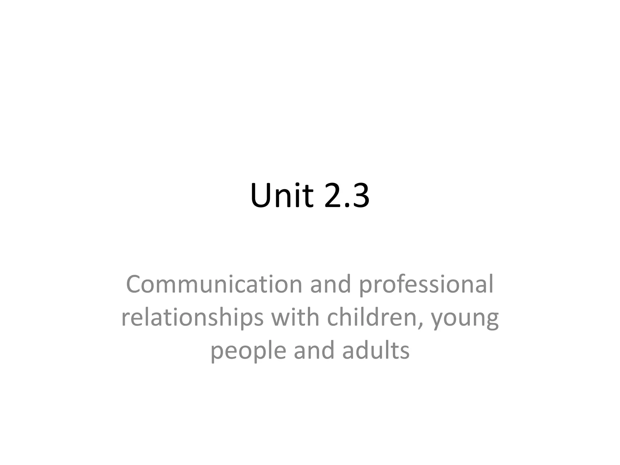 This document outlines the learning outcomes and content for a unit on communication and professional relationships with children, young people, and adults. The unit covers establishing respectful relationships, interacting appropriately with different age groups, communicating differences, dealing with disagreements, and maintaining confidentiality according to legal requirements and protocols. Key topics include relationship building, developmental stages, role modeling, adapting communication styles, and identifying when confidentiality must be breached.
