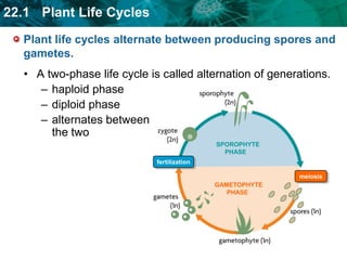 1. Plant life cycles alternate between a sporophyte phase and gametophyte phase through the process of meiosis and fertilization.