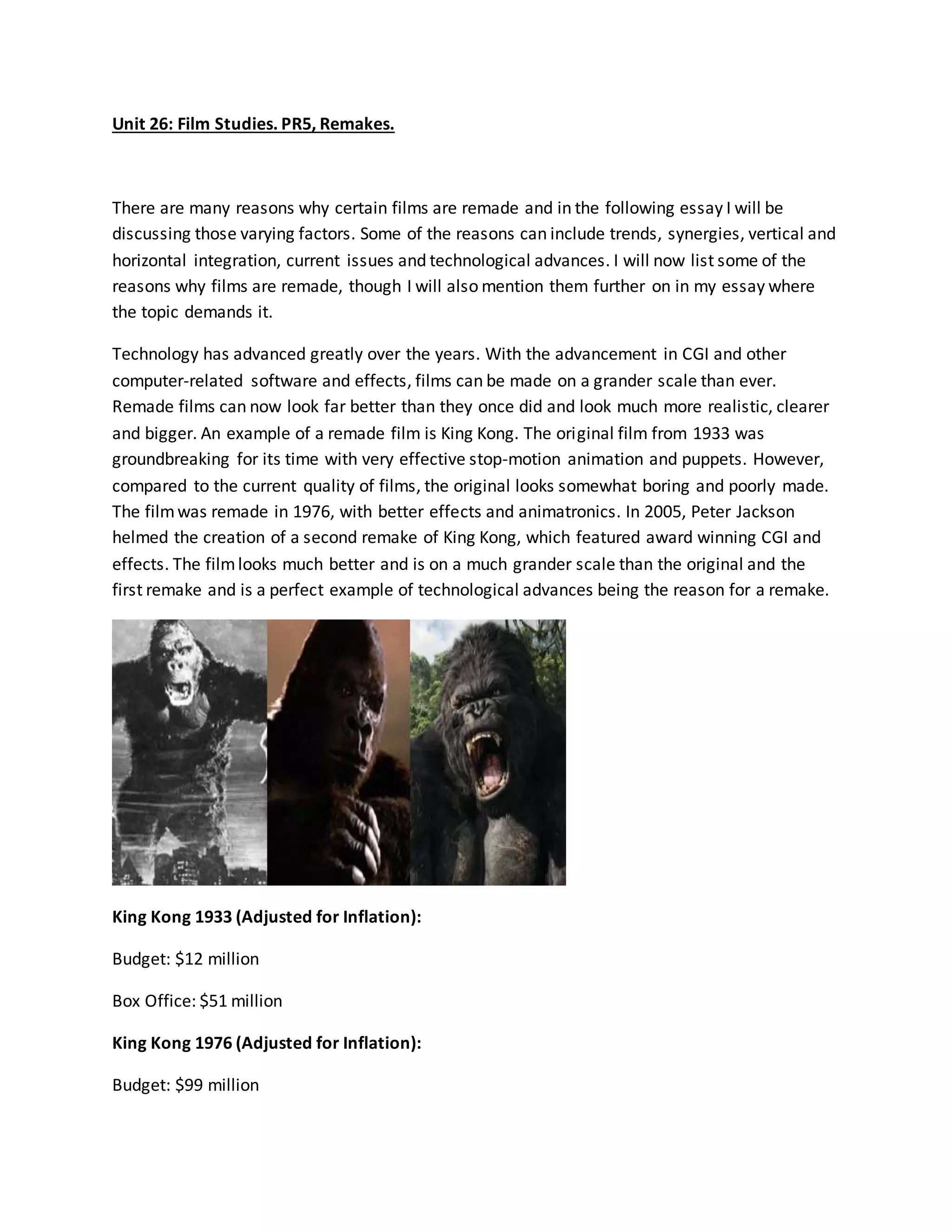 This document discusses reasons why films may be remade, using several film examples to illustrate points. Technological advances allow remakes to have improved visual effects and scale compared to originals, as seen in King Kong remakes. Films may also be remade due to trends in popularity of certain genres, as found footage films were remade after the success of The Blair Witch Project. Stars can boost interest in remakes, like Chloe Grace Moretz's role in the Carrie remake. Social and political contexts may also influence remakes to better resonate with current audiences. Judge Dredd was remade for its grittier visuals aligning with fans and technology, though it made less money. Rec was remade as