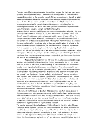 This document discusses auteur directors and how they break conventions of genres in their films. It provides examples of several films and their directors that demonstrate auteur styles, such as Francis Ford Coppola's Apocalypse Now, which subverts expectations of the war genre. Luc Besson is also cited as an auteur for changing norms in Leon, making the young girl the main character rather than an older woman. Rian Johnson mixed genres by combining sci-fi and action in an original way. In conclusion, auteur directors make films their own through unique styles that differ from standard genres.