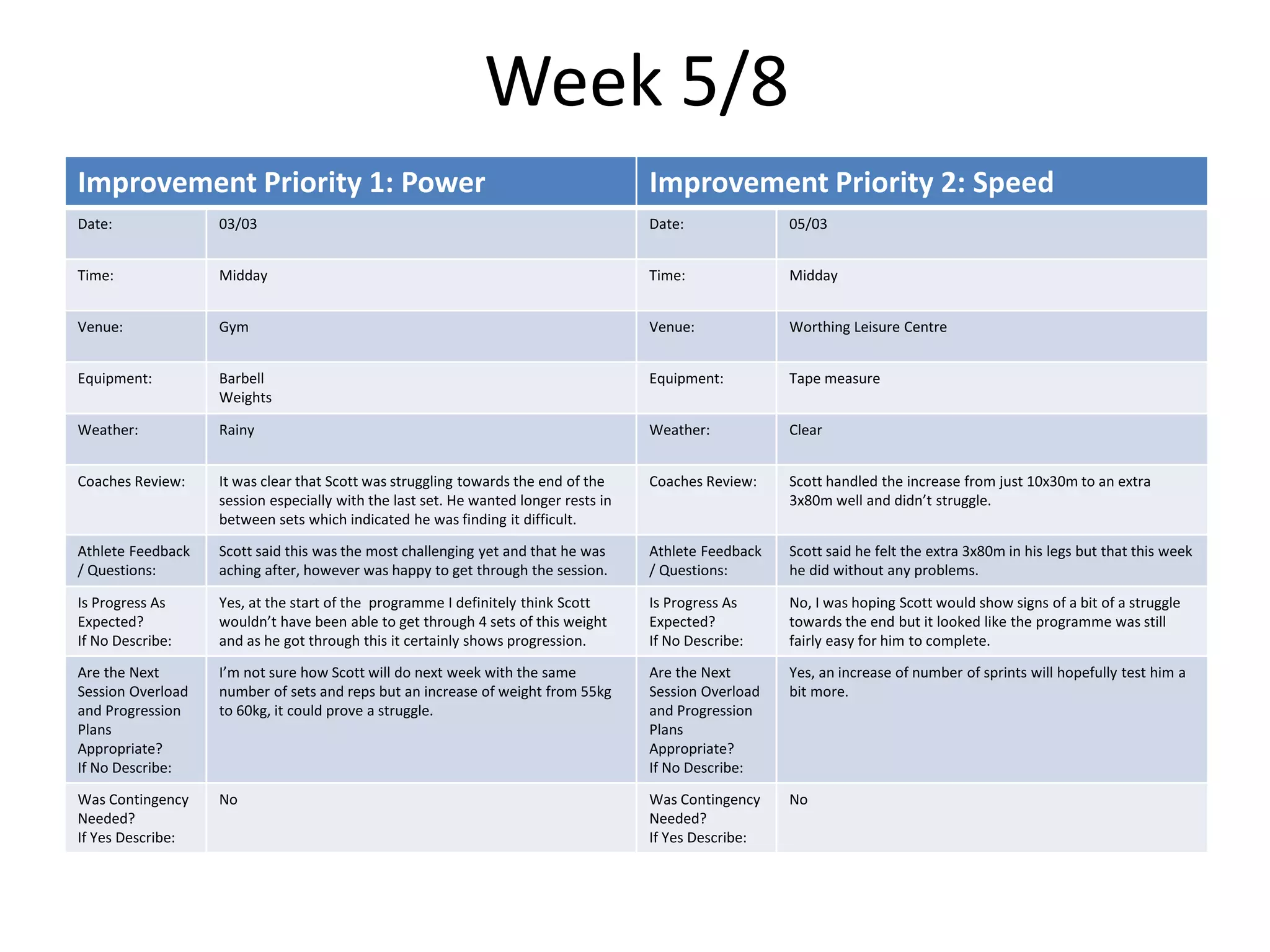 The document summarizes an 8-week training program focused on improving Scott's power and speed. For power training, Scott progressed from 4 sets of 6 reps at 55kg to 4 sets of 8 reps at a higher weight. He struggled at times but completed all sessions. For speed, the number of sprints increased from 10x30m to include extra longer distances. Scott handled the increased workload well over the weeks. Final testing showed Scott's vertical jump was above average for power and his sprint time was average for speed.