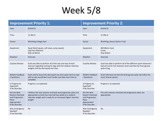 This document summarizes Oscar Gamble's 8-week training program for athlete Scott Goodman. Over the 8 weeks, Scott worked on improving his leg strength and sprinting. The training consisted of weight lifting and track workouts twice a week. Scott struggled at times with increased intensity but was able to complete all workouts. By week 8, Scott showed average results on power tests but good results for speed. The training program achieved its expected progress for Scott.