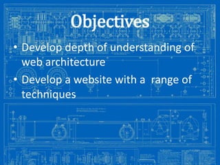 This document outlines an assignment for developing advanced knowledge of web architecture and creating a website. It includes objectives to understand web architecture and develop a multi-page website. Students are instructed to create posters explaining how web browsers and email work, define technology buzzwords, and write a report on how TCP/IP protocols allow communication. Time is allocated to complete the posters and website during and outside of class lessons.