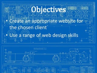 This document outlines the objectives, key dates, and tasks for a project to create a website. The objectives are to create an appropriate website for a client using web design skills. Key dates are provided from January to March for completing stages of website creation and design assignments. Today's tasks involve developing the website further, completing any outstanding assignments 1 or 2, and getting feedback on those assignments. Next week involves continuing website work, focusing on completing additional assignments, and adding new content about website accessibility.
