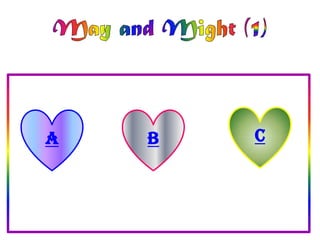 This document discusses the use of the words "may" and "might" to indicate possibilities. It notes that may and might have the same meaning and are used to suggest something is possible but uncertain. Examples are provided showing their use in affirmative and negative forms. A distinction is made between the negative forms "may not" and "might not" which suggest something is still possible versus "couldn't" which indicates something is not possible.