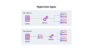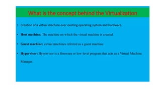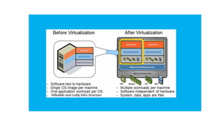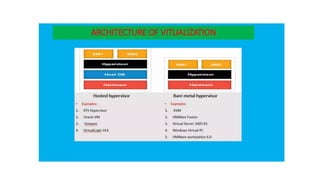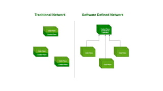 The document provides an in-depth overview of cloud computing, focusing on virtualization technologies, including hypervisors and types of virtualization such as hardware, operating system, and server virtualization. It elaborates on software-defined networking (SDN) and network functions virtualization (NFV), explaining their importance, architecture, benefits, and use cases in managing and deploying network services efficiently. Key components, advantages, and disadvantages of SDN and NFV are highlighted to illustrate the evolution and modernization of networking paradigms.