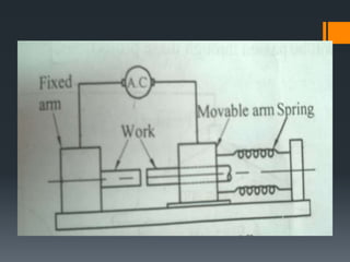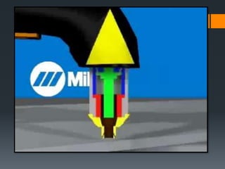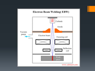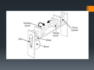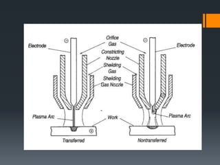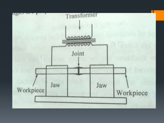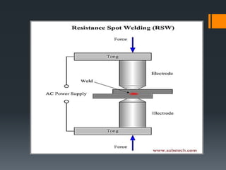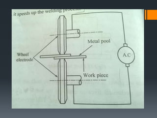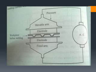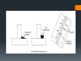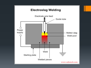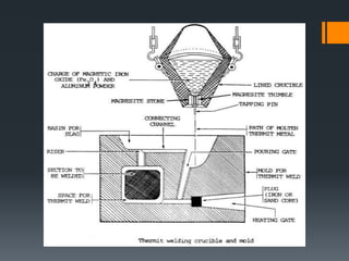 The document discusses various welding processes. It defines welding as the process of joining similar metals through the application of heat. Welding processes are classified based on the source of energy used, such as fusion welding which melts the metal, and plastic welding which heats metal to a plastic state. Specific welding techniques covered include gas welding using oxy-acetylene flames, and shielded metal arc welding where an electric arc melts the metal between an electrode and workpiece. The document provides detailed descriptions of equipment, procedures, and applications for these common welding methods.
