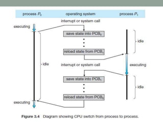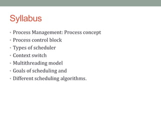 This document discusses process management in operating systems. It covers key topics like process control blocks, scheduling queues, types of schedulers (long-term, short-term, medium-term), context switching, multithreading models (many-to-one, one-to-one, many-to-many), and scheduling algorithms. The document provides details on how operating systems manage processes and computer resources to ensure efficient execution of programs.
