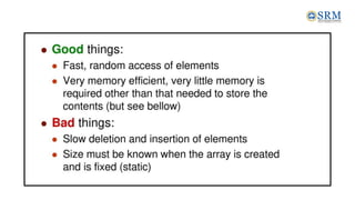 This document discusses representations of sparse matrices using linked lists. It explains that sparse matrices, which contain mostly zero values, can be stored more efficiently using a triplet representation or linked representation rather than a standard 2D array. The triplet representation stores only the non-zero elements, their row and column indices, and matrix size information. It provides an example of a 4x5 sparse matrix represented as a triplet array with 6 non-zero elements. Linked representation stores the sparse matrix as a linked list, where each node contains the row, column and value of a non-zero element. Applications of sparse matrix representations include storing large sparse datasets efficiently.