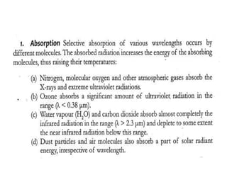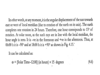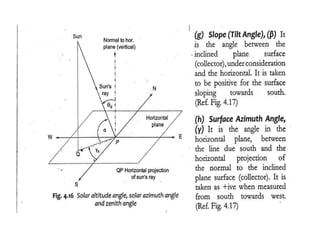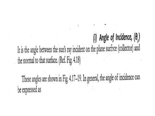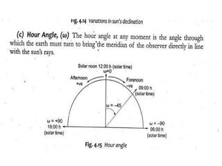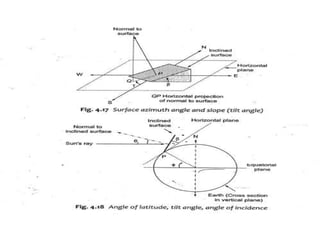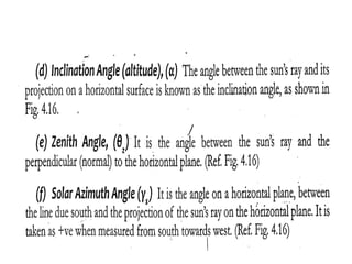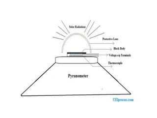 2. Measurement of solar radiation is discussed, including devices like pyranometers and pyrheliometers. Common solar energy technologies are described, such as flat plate collectors, solar water heaters, photovoltaic systems, and solar collectors.