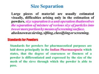 This document discusses size separation techniques used in pharmaceutical manufacturing. It describes five grades of powder defined by the size of sieve they pass through, from coarsest to finest: coarse (10 sieve), moderately coarse (22 sieve), moderately fine (44 sieve), fine (85 sieve), and very fine (120 sieve). It also discusses various sieving methods like mechanical sieving using agitation, brushing, or centrifugal force and wet sieving techniques like sedimentation and elutriation that are used to separate particles by size. The key sieving methods, their advantages and applications in pharmaceutical manufacturing are summarized.